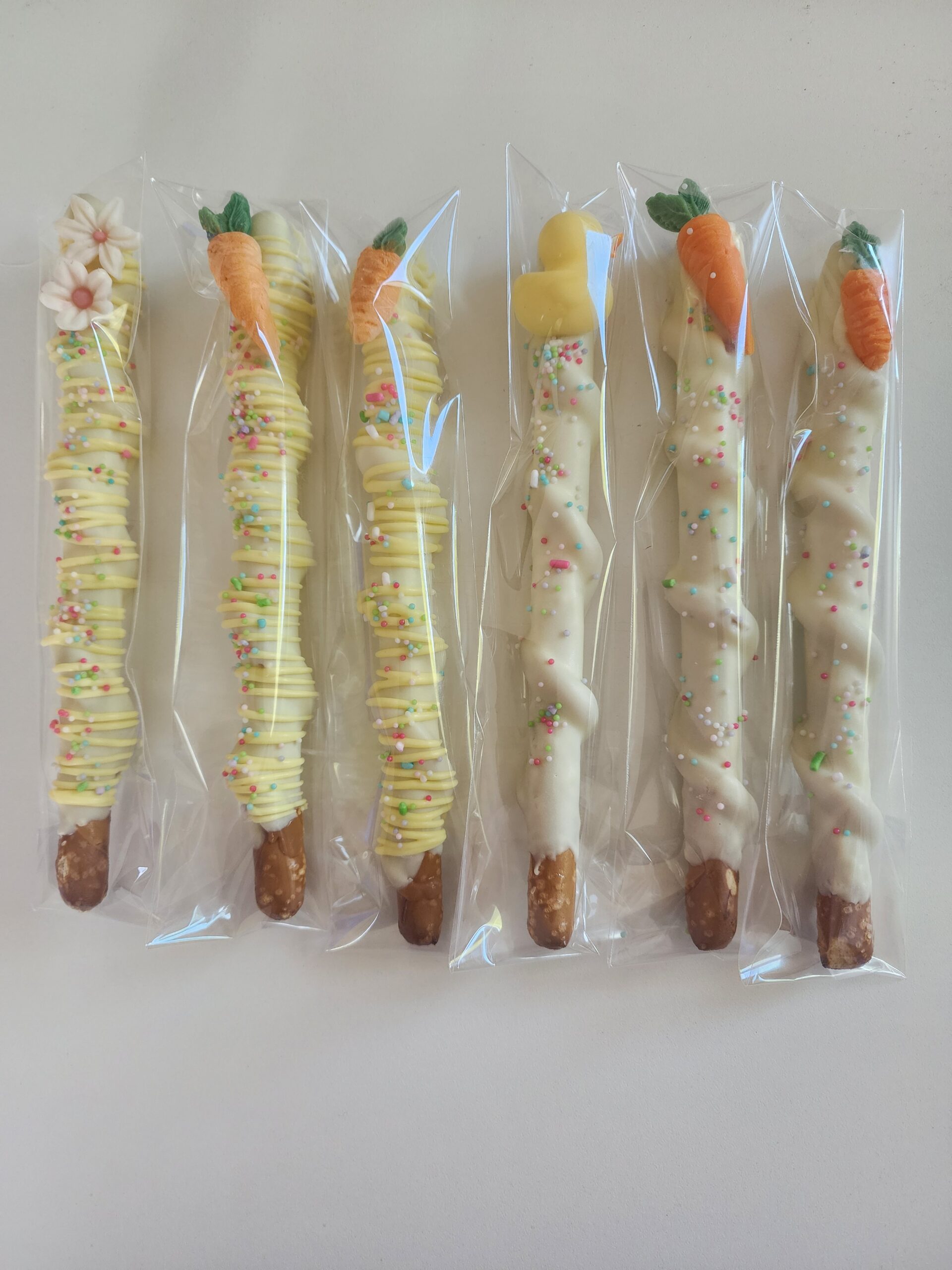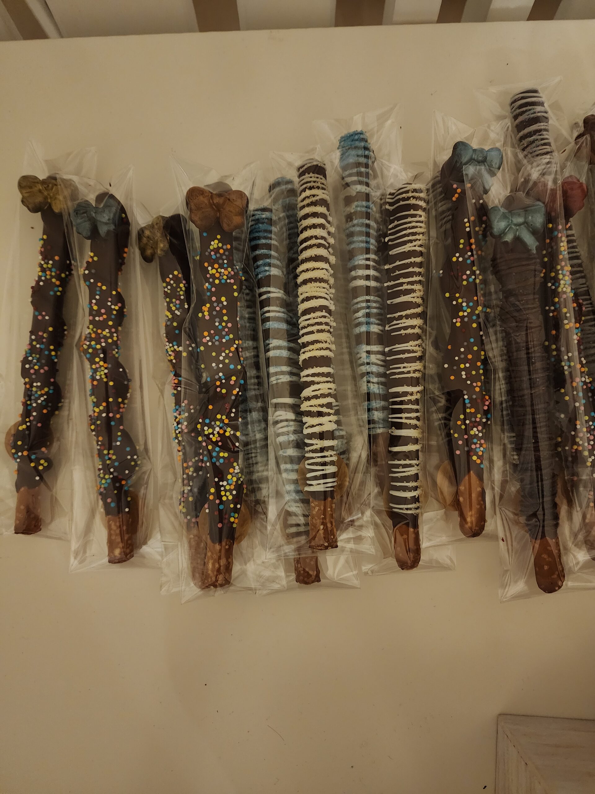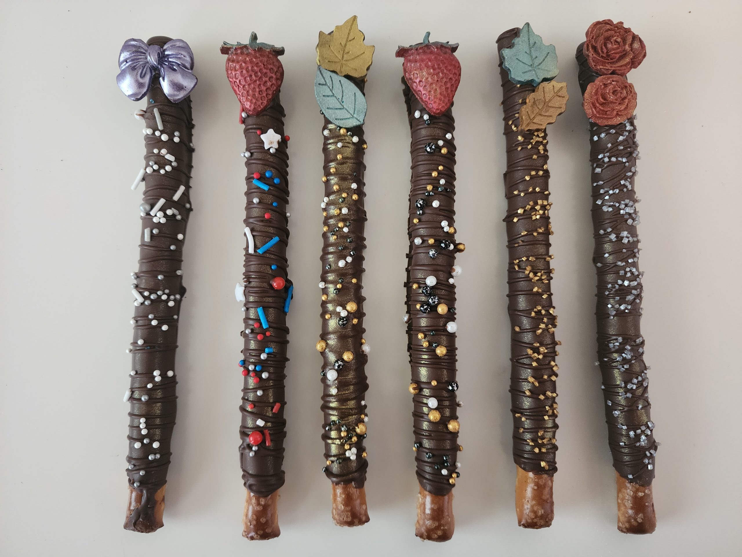 Crisp pretzels dipped in chocolate and decorated for holidays, parties, or gifts.