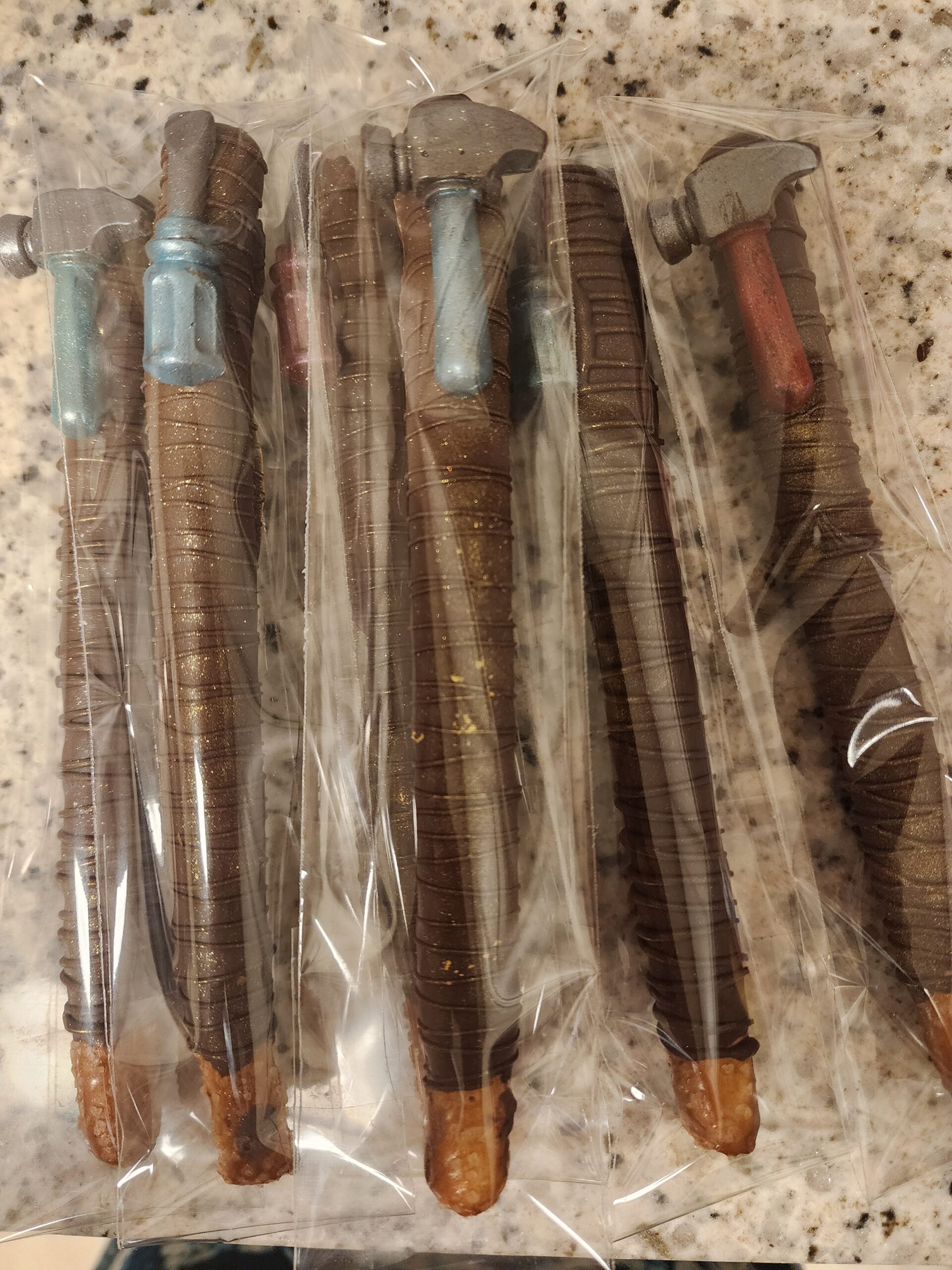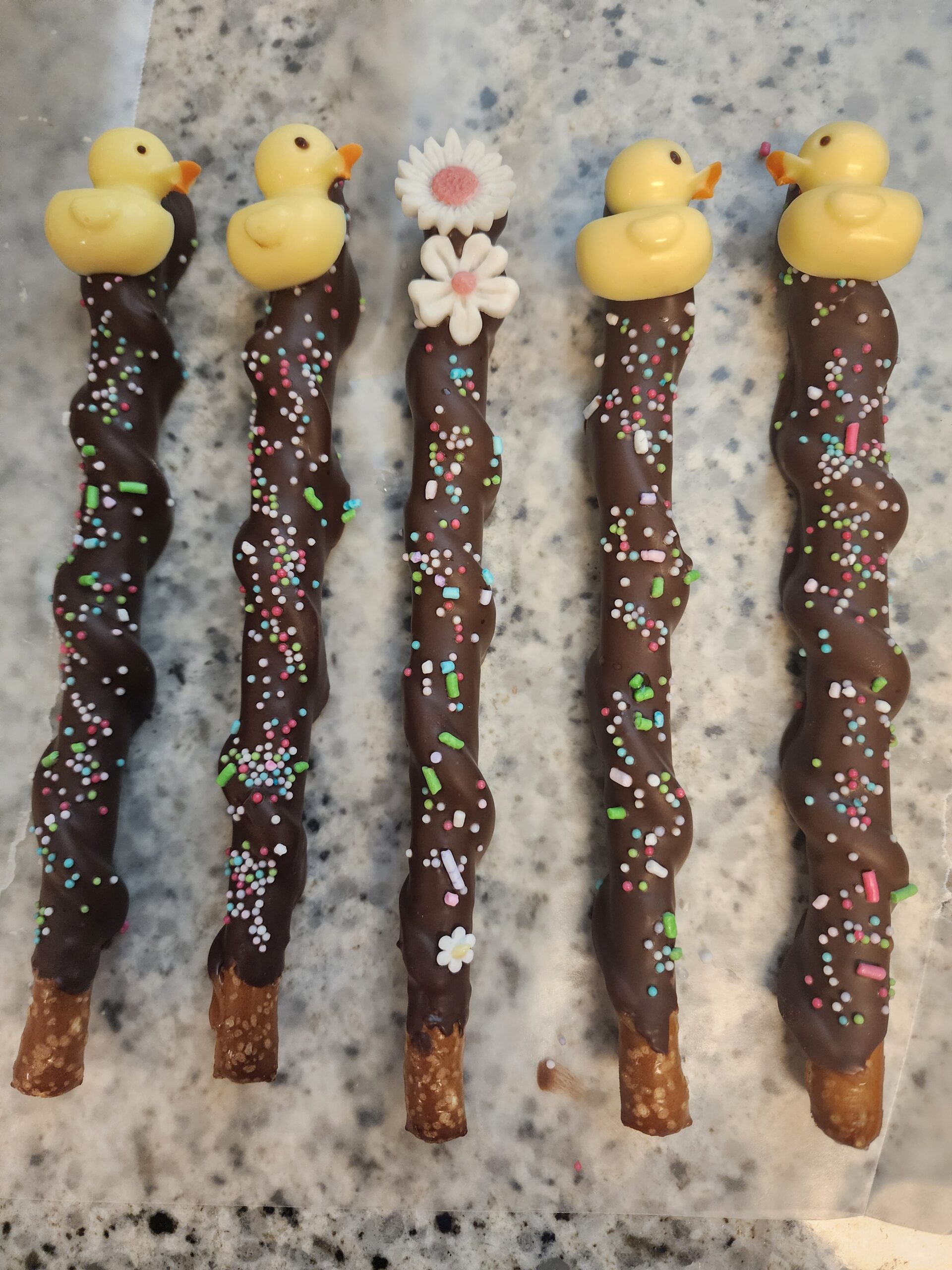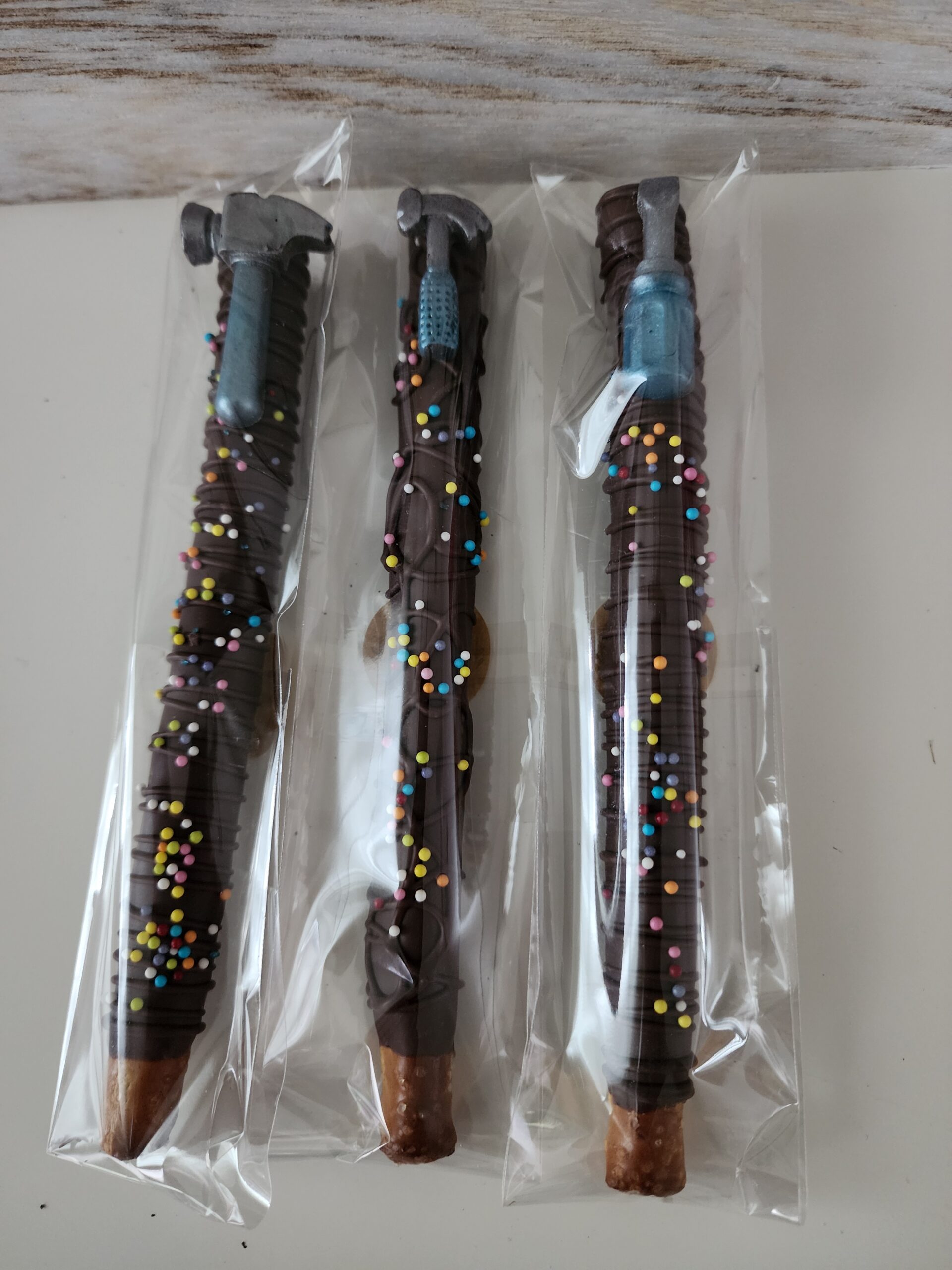 Crisp pretzels dipped in chocolate and decorated for holidays, parties, or gifts.