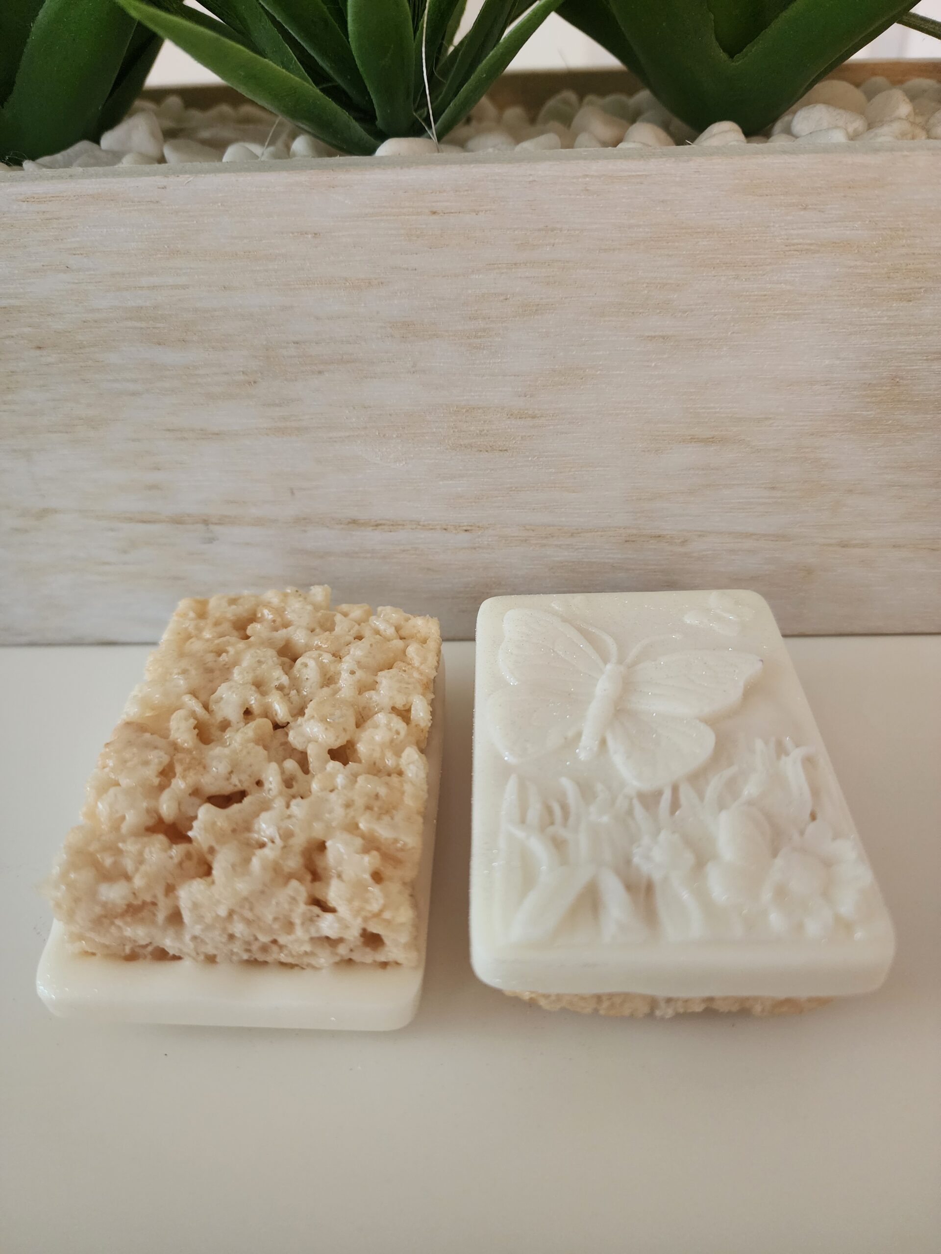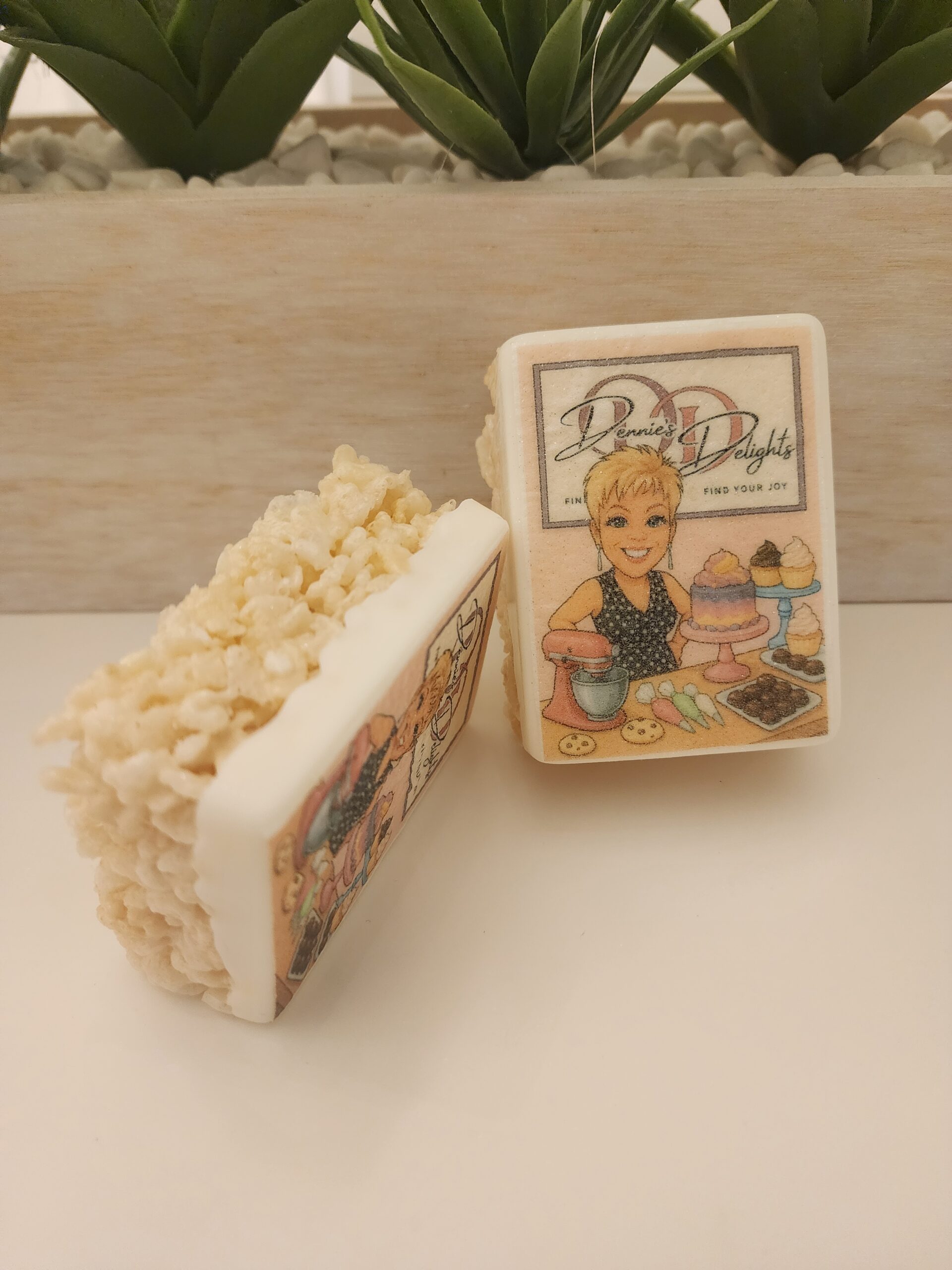 Chewy squares topped with white chocolate and customizable with images or logos.